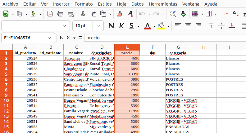 Al hacer click se nos descargará un excel que al abrirlo tendrá el listado completo de nuestros productos.